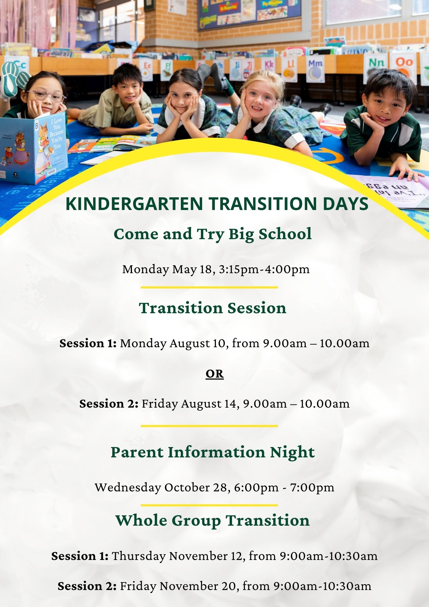 Whole Group Transition 1 and 2 – All enrolled Kindergarten 2027 to students to attend.