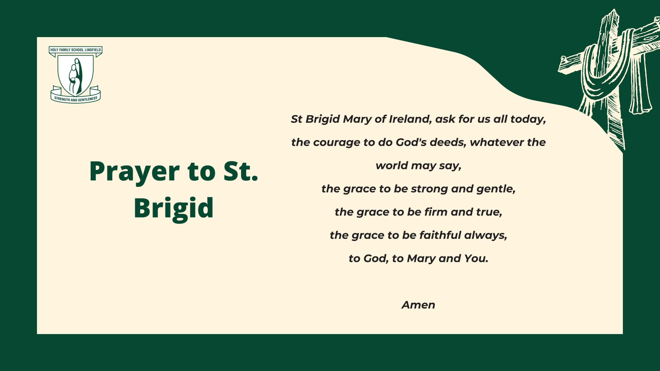 We recognise our history and the foundations that have been established to help create the school that we are today. Our school was originally founded in 1927 by the Sisters of Mercy. The order changed to the Sisters of Saint Brigid in 1939. We are a Brigidine School and we are proud of our foundations. Our daily prayer reflects our values and beliefs.